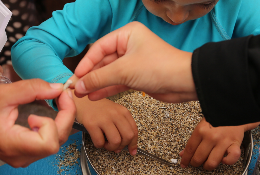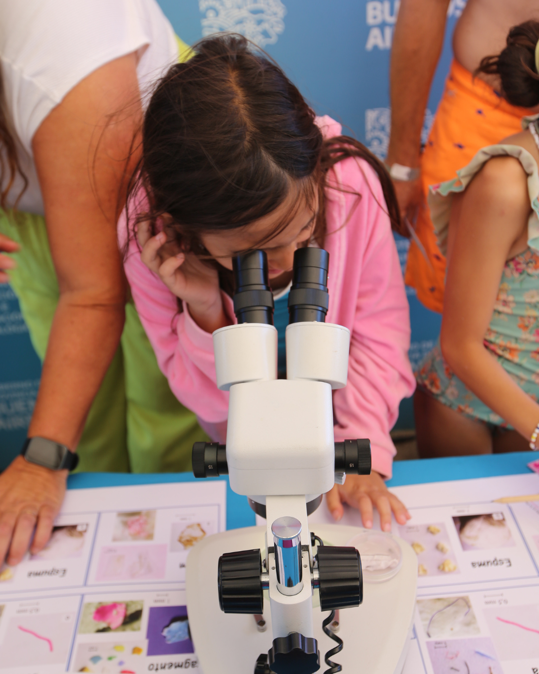 Durante el encuentro las científicas respondieron a las preguntas que realizaron las familias y realizaron la actividad “Detectives de Microplásticos”. Allí se encontraron con el material para recolectar material plástico de la arena, reglas para medirlos y clasificarlos según su tamaño, lupas para finalizar la investigación analizando los contaminantes y regalos lúdicos para continuar explorando con sus familias y desarmando los estereotipos de género que se asocian normalmente con la ciencia. La actividad incluyó la identificación de plásticos presentes en la arena, su medición y visualización en lupa binocular. La visualización con lupas binoculares fue posible gracias al instrumental que la Facultad de Ciencias Exactas y Naturales, donde las investigadoras son docentes, prestó para la jornada.